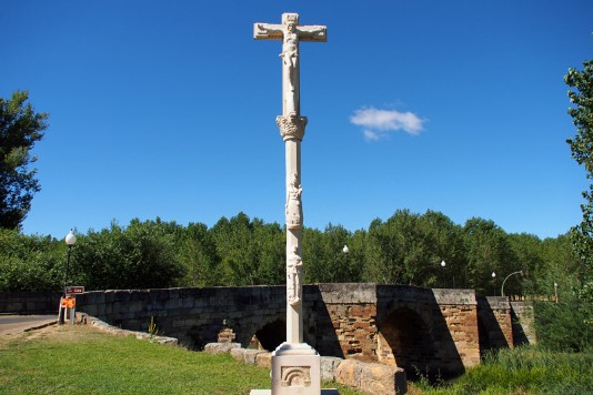 Ich breche im Dunkeln auf. Auch in Valverde ist es noch dunkel. Einige Pilger verlassen gerade die dortige Herberge. Norbert überholt mich. In San Miguel ist auch noch alles dicht. In Villadangos del Paramo ist wieder wie im letzten Jahr Mittelaltermarkt, aber auch hier schläft noch fast alles. In meinem letztjährigen Hostal bekomme ich dann doch noch einen Cafe con Leche. Wie in den letzten Tagen wird es wieder sehr warm. Über San Martin erreiche ich Puente de Orbigo und über die wunderschöne Brücke dann Hospital de Orbigo. Mittags treffe ich wieder Norbert zu einem Bier. Da Sonntagnachmittag ist, ist es mit Einkaufen für die nächste Etappe schwierig. Auch ein Kirchenbesuch ist an diesem Sonntag nicht möglich. Am Abend treffe ich Dino aus Genua zu einem gemeinsamen Fototermin auf der Brücke.
